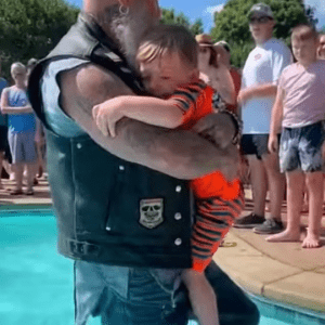 American Biker Jumps Into a Pool to Save a Young Swimmer During a Sudden Muscle Cramp