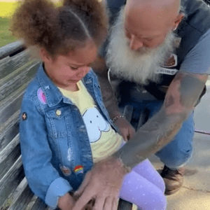 American Biker Gently Helps a Little Girl Trapped on a Park Bench, Proving Calm Can Solve Anything