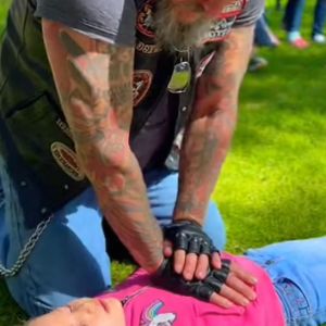 American Biker Kneels in a Crowd to Calm a Panicked Child