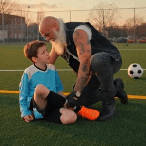 A BIKER STEPS IN WHEN A YOUNG SOCCER PLAYER NEEDS HELP MOST
