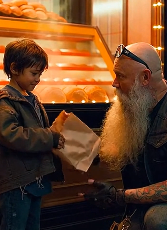 Jake, a biker with years on the road etched into his leather jacket, slowed his Harley as he passed the corner. He had seen plenty in his life—long stretches of highway, harsh streets, and kids who’d learned that sometimes the world isn’t for them. And right away, he recognized it. The boy wasn’t simply hungry. He was trained by life to just look, never touch; to want, but never have.