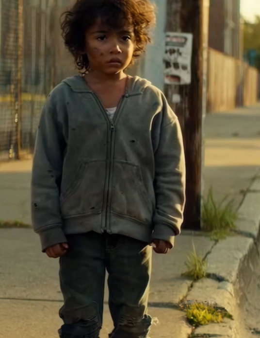 Behind the building, tucked away like someone didn’t want to see him, sat a little boy. Maybe four years old. Maybe younger. His jacket was too thin for the wind, sleeves swallowing his hands. Dirt streaked his cheeks, not fresh, like it had been there a while.