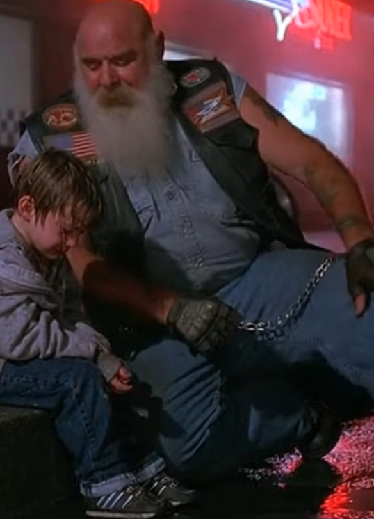 “Hey,” the biker said calmly. “This kid got separated from his family. Can we call it in?”