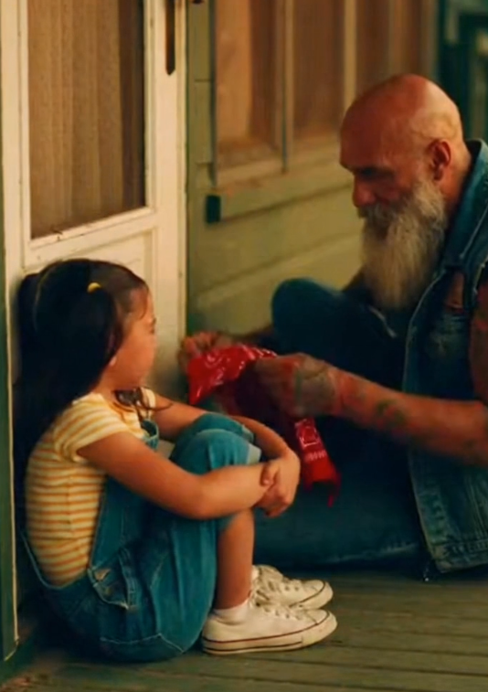 As the shouting inside grew louder, the girl pulled her knees closer. You could almost feel her trying to shrink away from the noise. The biker noticed—but he didn’t interrupt her fear. He acknowledged it.
