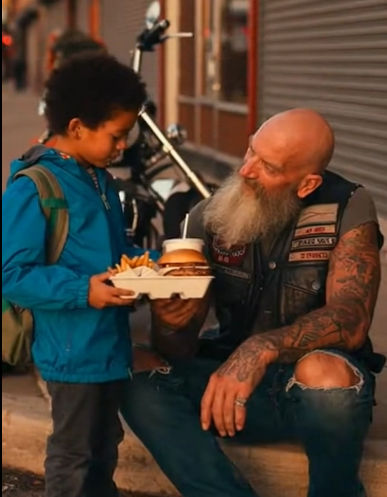 The biker smiled and waved it off like it was nothing. “Eat up,” he said. “That’s what matters.”