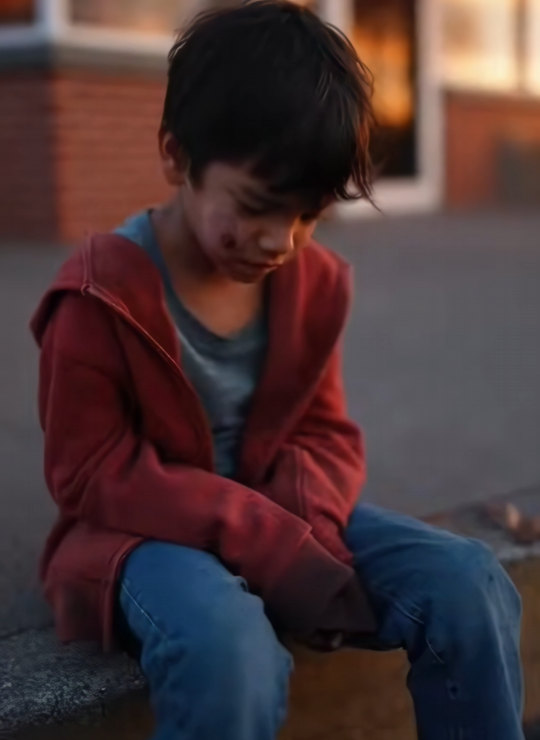 He sat on the curb outside the grocery store with his knees pulled up, arms wrapped tight around his stomach like he was trying to keep the hunger from spilling out. His face had that quiet, distant look kids get when they’ve already asked for help too many times and learned not to ask again. Eight, maybe nine years old. Old enough to understand punishment. Too young to understand cruelty.