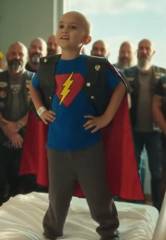 He wore a bright superhero costume, complete with a cape that swayed behind him as he moved. And layered over it all? A worn leather biker vest, far too big for his tiny frame—but somehow, it looked exactly right.