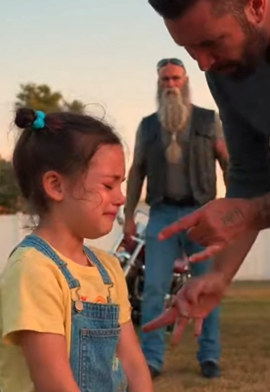 That’s when a motorcycle rolled up. Not fast. Not loud. Just steady—like someone who wasn’t afraid to step into discomfort. The biker cut the engine and took off his helmet. He didn’t interrupt right away. He watched. The girl’s stiff posture. The tension in the adults’ voices. The blame floating around without ever landing on something concrete.