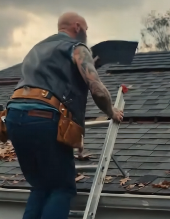 For the next few hours, the sound of a hammer replaced the rumble of the motorcycle. The biker climbed onto the roof carefully, peeling back damaged shingles, reinforcing weak spots, sealing what the storm had opened. He worked methodically, like time wasn’t something he needed to rush.