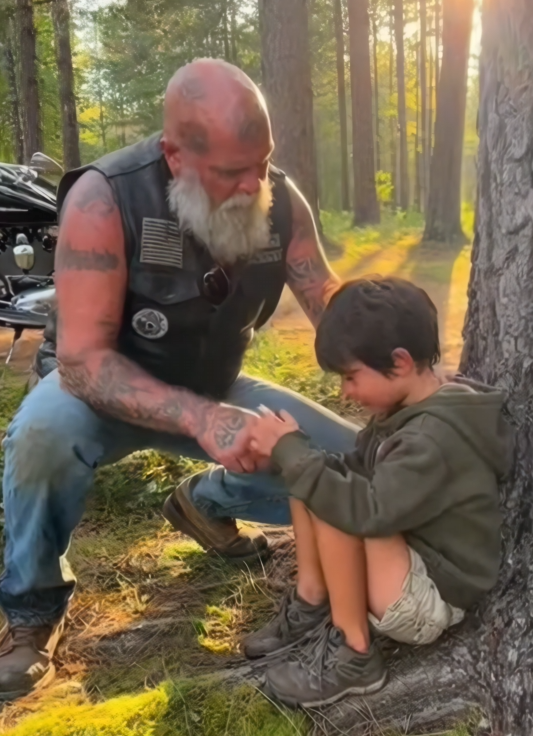 Deep in the woods outside a small town, a biker chose to listen, to stop, and to stay. He didn’t rush. He didn’t panic. He met fear with calm and turned a terrifying moment into a safe one.
