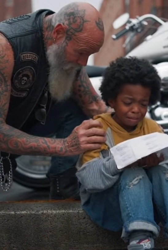 The biker crossed the street slowly, not wanting to scare him. “Everything alright, buddy?” he asked, voice calm and steady.