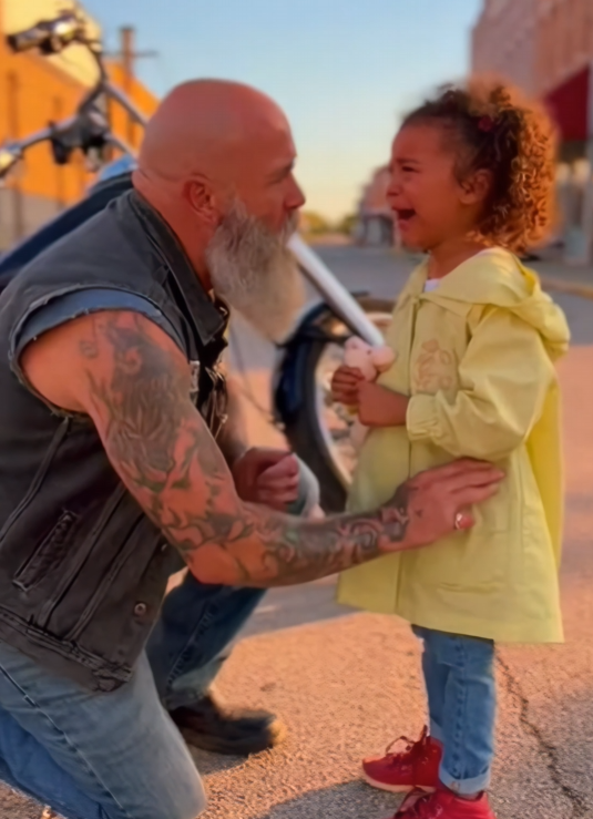 The biker noticed her from across the parking lot. It wasn’t dramatic. No crowd. No obvious danger. Just a small girl crouched near a bench, arms wrapped tightly around herself like she was trying to disappear. Her breathing came fast and uneven, chest rising and falling too quickly to keep up. Panic was written all over her face.