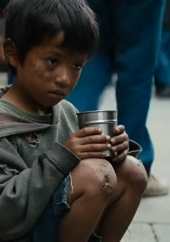 The boy swallowed hard and forced himself to keep asking for money. His hands trembled. His shoulders stayed tight. Fear sat just under his skin, barely contained.