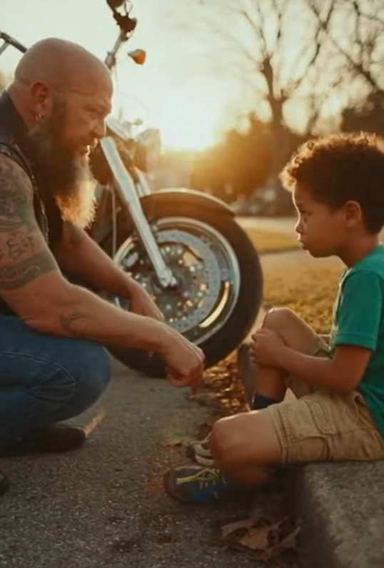 The biker wrapped the cloth gently around the knee, not rushing, not forcing conversation. His hands were steady, practiced. But his eyes stayed on the boy’s face.