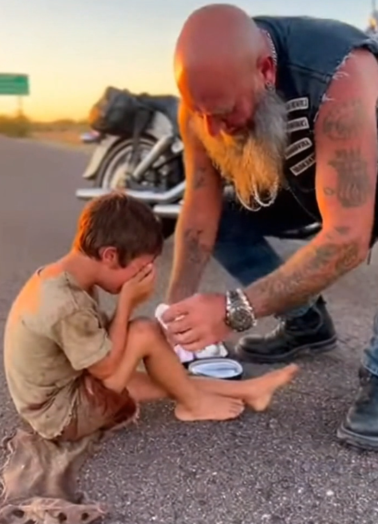The biker checked carefully. No panic. No sudden movements. He looked for swelling, for cuts, for signs the boy needed more than basic help. Then he took off his jacket, folded it, and placed it gently around the boy’s shoulders.