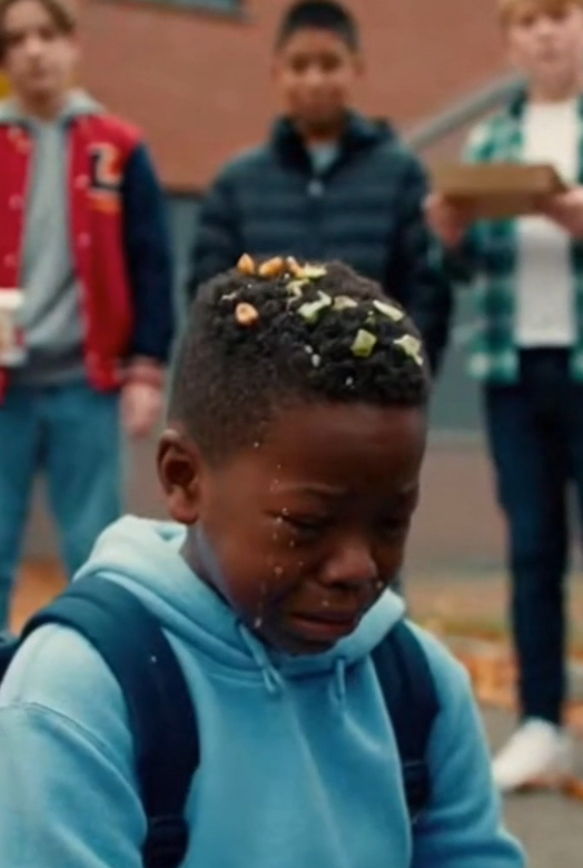 Near a bench by the school fence stood a young Black boy, maybe seven or eight years old. His lunch tray lay overturned at his feet. Food clung to his hair and shirt, dripping slowly onto the concrete. His shoulders shook as he cried, trying to wipe his face without making the mess worse.