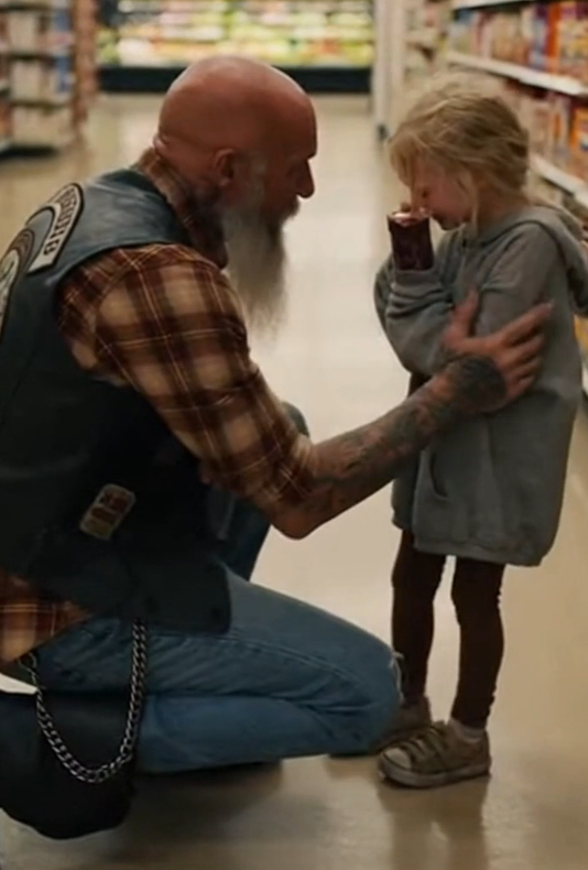 Leather vest. Road-worn boots. A helmet tucked under his arm. He had been waiting in line when he heard the commotion, and something about the child’s face made him pause.