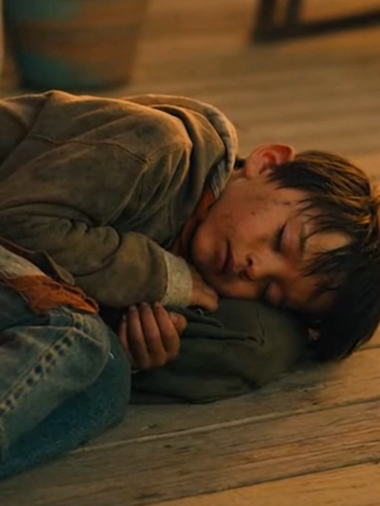 He crouched down, lowering himself to the boy’s level. The boy stirred slightly, eyes opening just enough to take in the stranger.