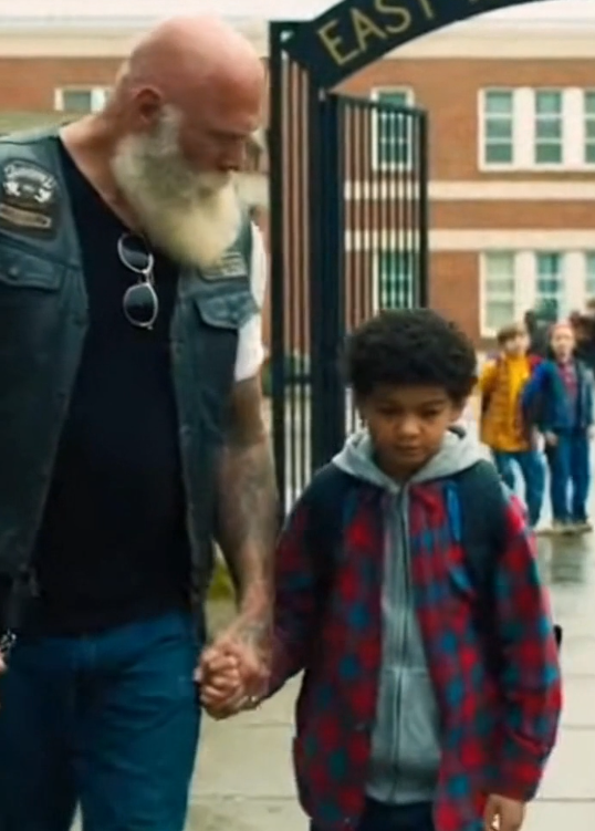 The biker didn’t stride ahead. He didn’t tell stories or ask questions that needed answers. He walked slowly—on purpose—matching the boy’s small steps. When the boy stopped to take a breath, the biker stopped too.