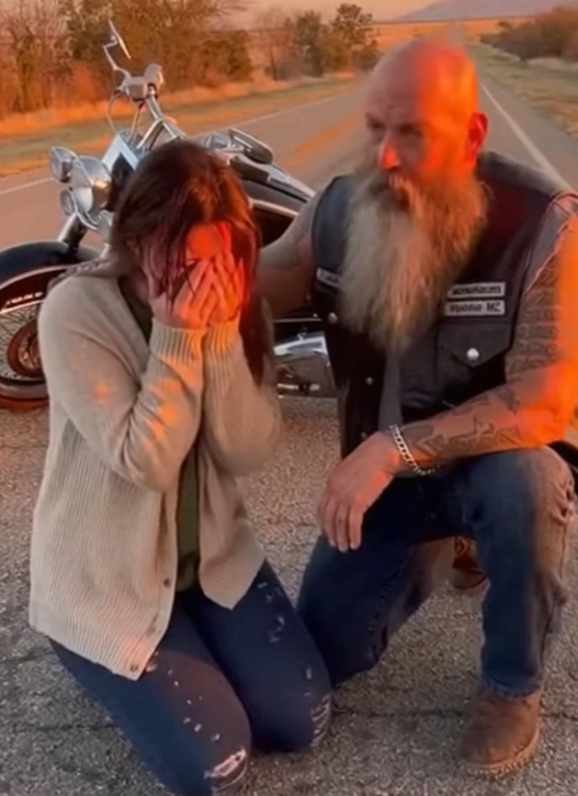 The biker crouched to her level, keeping a respectful distance, his voice steady and reassuring. “You did exactly what you needed to do,” he said. “You got through it. Help’s on the way.”