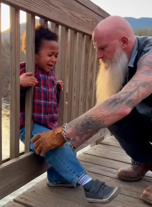 “Hey, hey,” the biker said calmly as he crouched down to the boy’s level. “You’re okay. We’ve got time.”