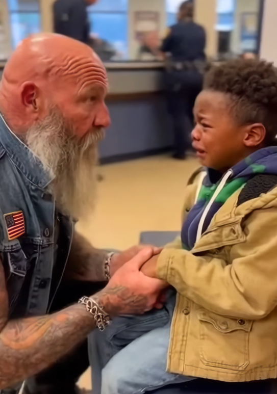 When they reached the police station, officers came out right away. The biker explained what happened, keeping a steady hand on the boy’s shoulder. One officer knelt down, spoke softly, and asked the boy the same gentle questions.