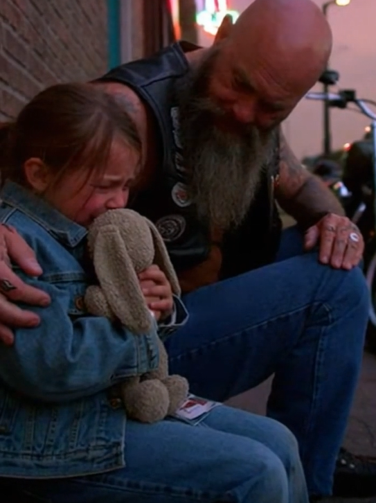 The late afternoon sun poured its golden light across a sleepy town, casting long shadows over cracked sidewalks. A lone biker rolled slowly down the empty street, the low rumble of his Harley echoing off the old brick buildings. The world seemed still—but then he saw her. A little girl sitting on the curb, knees drawn to her chest, clutching a worn, ragged stuffed animal.