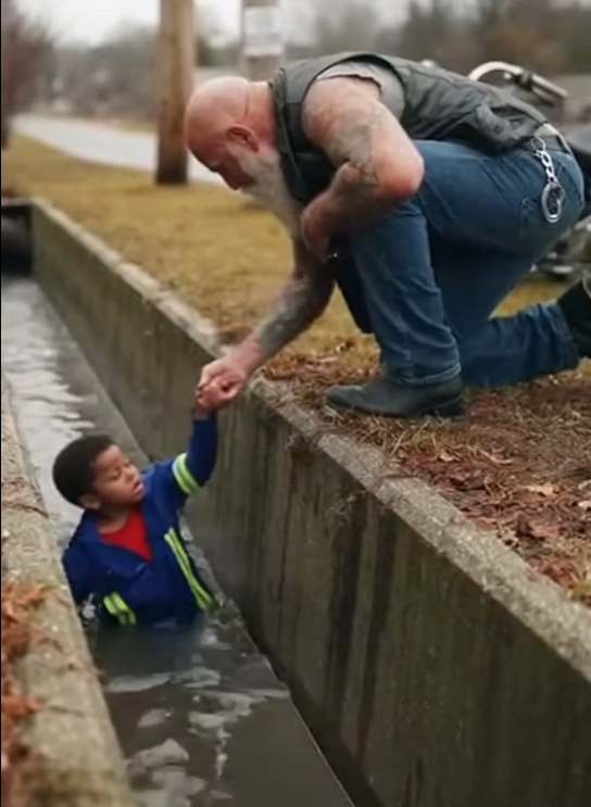 When the boy finally reached the top, the biker grabbed him under the arms and pulled him onto solid ground. The moment his feet touched the pavement, the tension broke.