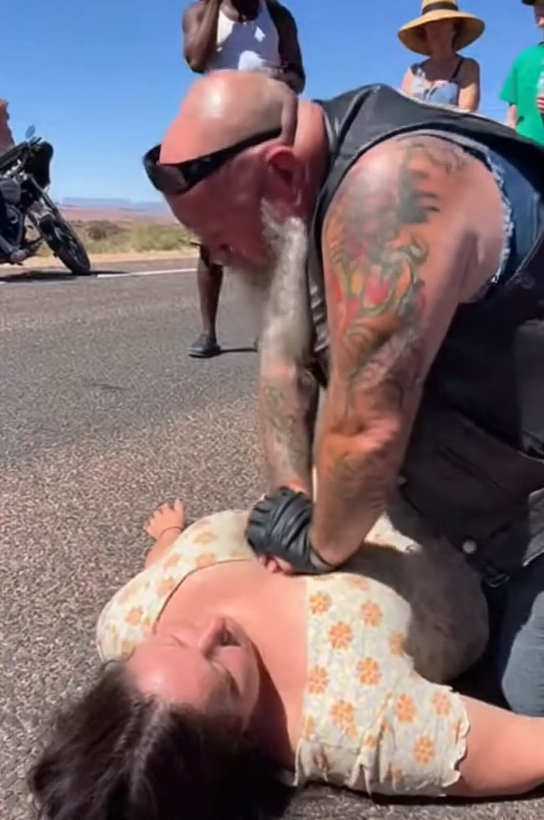 The biker didn’t rush in like a hero from a movie. He didn’t crowd the woman or make sudden moves. Instead, he knelt a few feet away, keeping respectful distance, keeping his voice calm and grounded.
