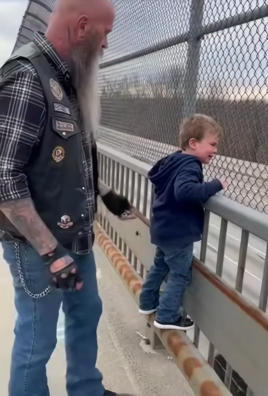 A small figure stood on the overpass, fingers locked around cold metal rails. One foot rested on the lower bar, testing the edge between staying and leaving. He wasn’t crying. He wasn’t yelling. And that scared the biker more than anything else.