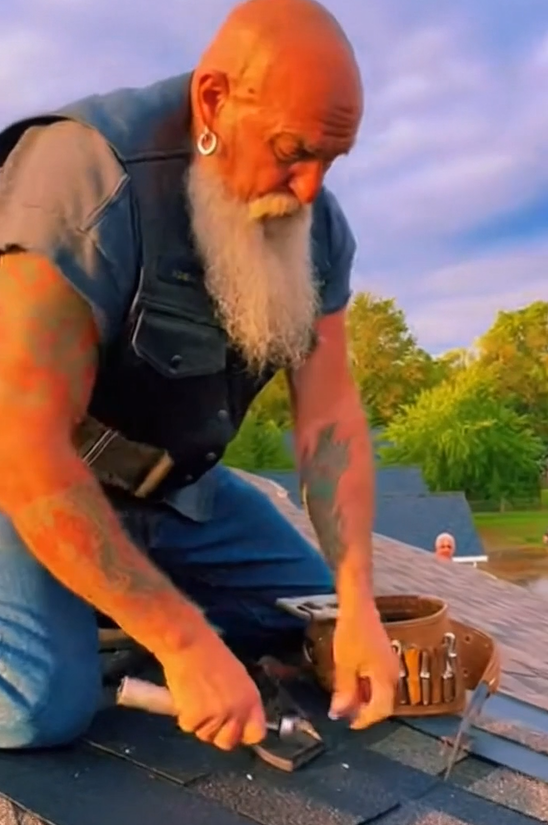 Within minutes, the ladder was set and Mike had his jacket off. He climbed carefully, inspecting the damage with a practiced eye. This wasn’t guesswork. Years ago, before the road became his therapy, Mike had worked construction. Roofs like this were familiar territory.
