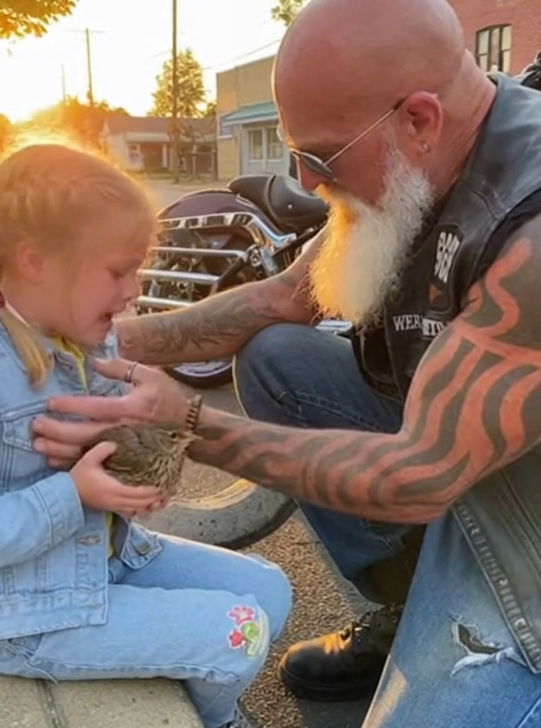 The girl stayed close to him, careful with every step. She whispered to the bird as if it could hear her, telling it everything would be okay. The biker didn’t interrupt. He understood moments like this didn’t need fixing—just space.