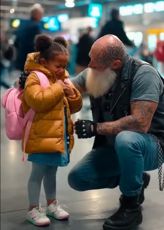 That moment mattered. Because instead of towering over him, instead of adding to the chaos, the biker met him where he was—low, calm, human.