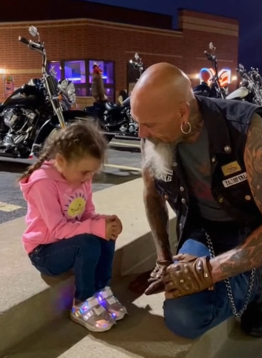 The biker crouched a few feet away, careful not to crowd her. He asked simple questions—her name, her age, where she lived. Each answer came softly, practiced. Like she’d learned early not to ask for too much.