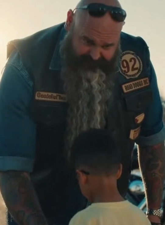 Behind Owen stood a tall man in a worn leather jacket. Gray beard. Relaxed posture. A motorcycle helmet hanging loosely from one hand. He hadn’t rushed in. He hadn’t raised his voice.