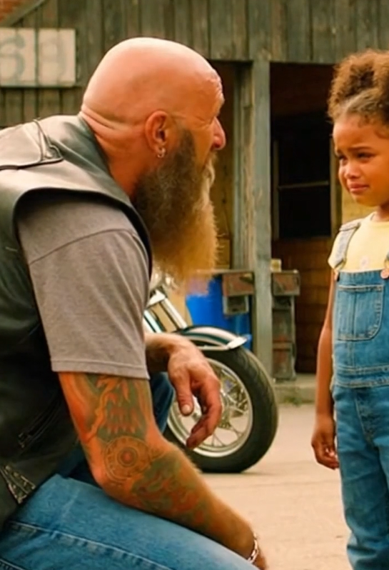 The biker crouched down, lowering himself to her level. He wanted her to feel safe, to know he wasn’t towering over her, to show that he was there to listen, not lecture.