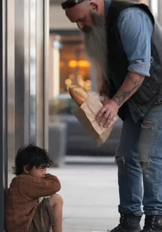 The boy ate like someone who hadn’t tasted real food in days. Not messy. Not greedy. Just focused. Like every bite mattered more than anything else in the world. The biker waited until the boy slowed down before taking his own half.
