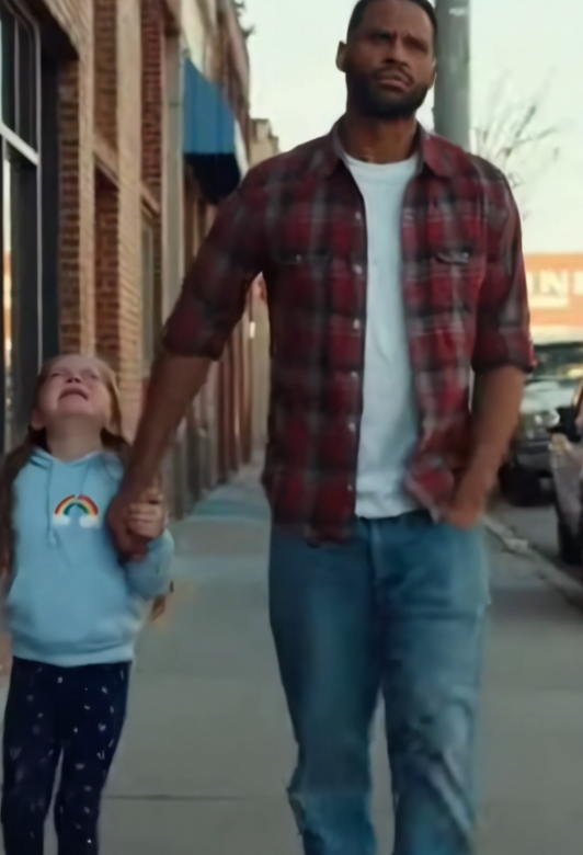 A man stormed outside, his face tense with frustration. Without slowing down, he grabbed the girl by the arm and began pulling her across the pavement.