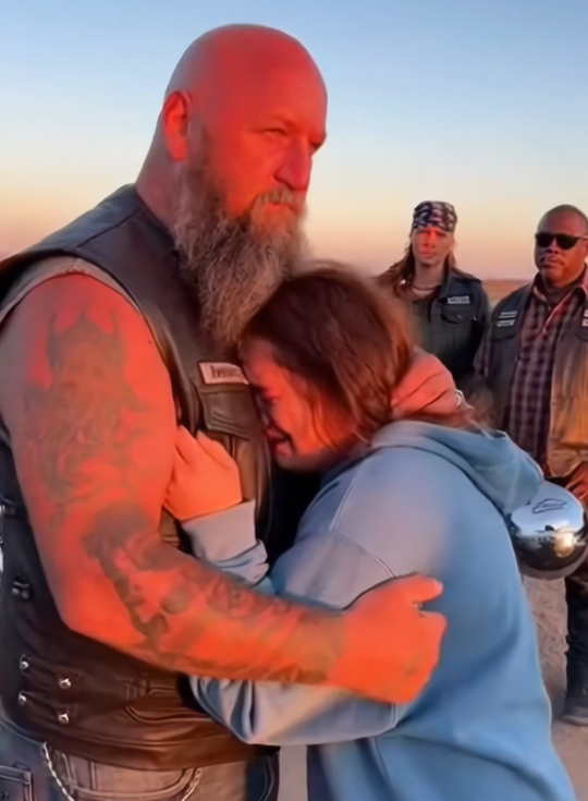 One of the bikers caught her before she hit the ground. She clung to him, then to the others, arms wrapping around leather and denim like they were the last solid things in the world.