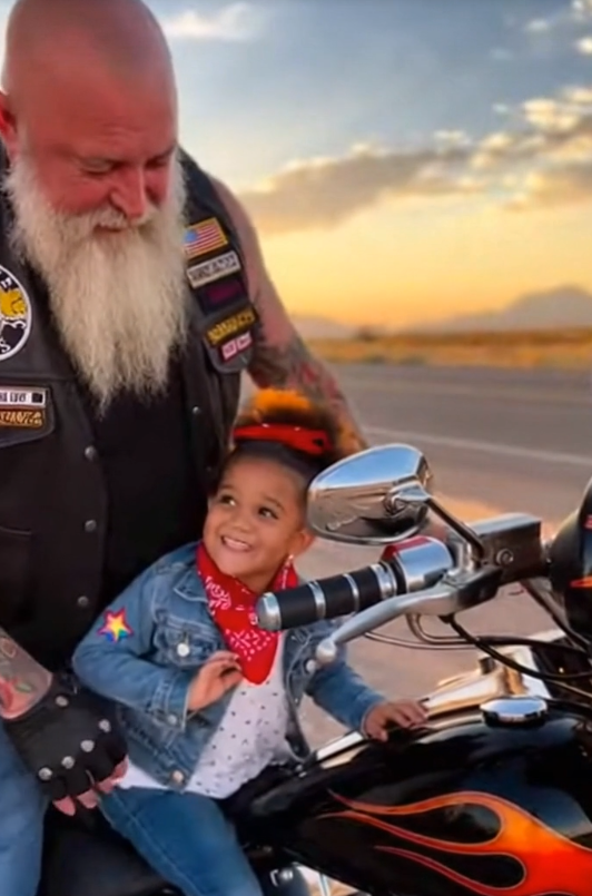 Grizzly carefully lifted the girl onto the wide leather seat of the motorcycle. Her feet barely reached the sides, but the moment she sat down, her expression changed completely.