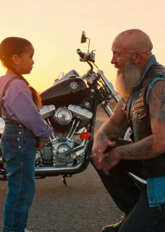 Grizzly ordered a cup of coffee and sat down with his riding buddies. But every few seconds he noticed the little girl still glancing toward him.
