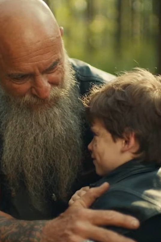 He was a big man—broad shoulders, gray beard, and a weathered leather vest covered in patches from years of riding American highways. His arms carried old tattoos, reminders of decades spent on the open road.