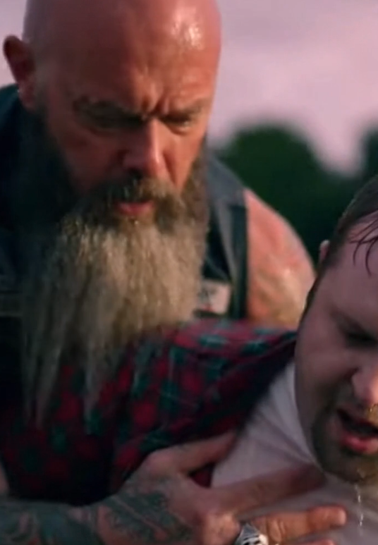 The biker wrapped one powerful arm under the man’s shoulder and pulled him upright.