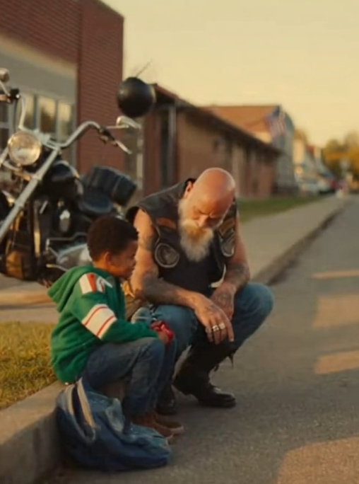 Before walking back to his motorcycle, the biker lightly patted the boy on the shoulder.