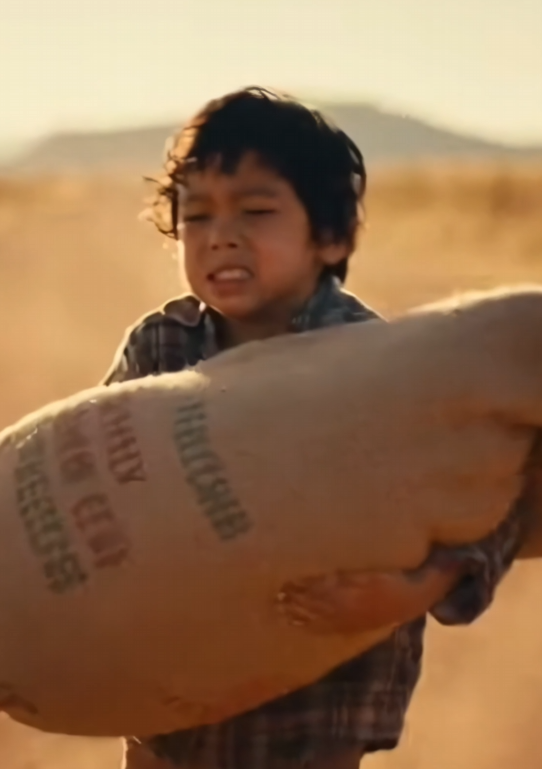 Near the stacked containers, a boy—no older than nine—staggered slowly across the gravel lot.