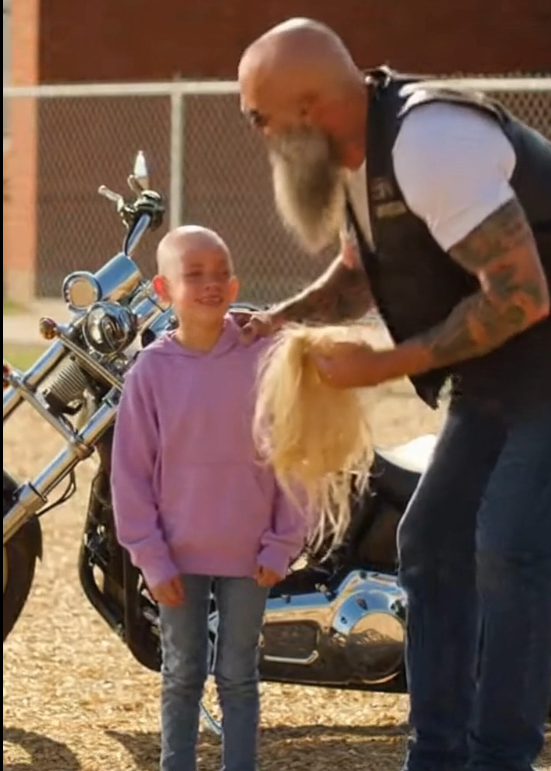 The biker stepped closer—not aggressively, just enough to close the space. He gently took the wig and handed it back to Harper.