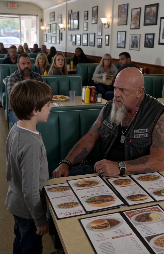 A small boy, no older than seven, stood near the counter. His posture was stiff, his eyes locked onto the biker.
