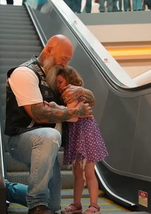 At that exact moment, a man wearing a worn leather vest stepped through the mall doors. He looked like someone who had spent years riding open highways—broad shoulders, weathered boots, and a gray-streaked beard that hinted at countless miles traveled. His motorcycle helmet hung loosely in one hand as he walked inside, heading toward a coffee stand across the lobby.