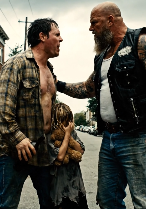 Leather vest. Worn jeans. Boots that carried miles of stories. A beard touched with gray, and eyes that didn’t miss a thing.