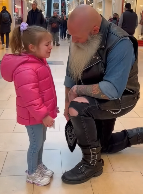 The mall noise didn’t stop. People kept flowing around them, shopping bags swinging, conversations overlapping. But around the biker and the girl, something shifted.